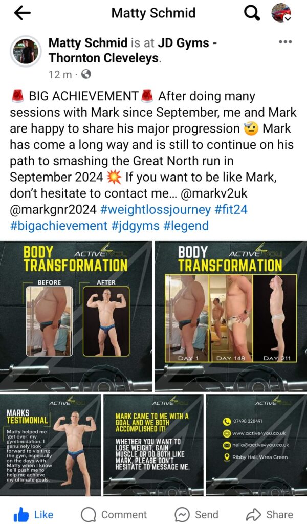 6th September 2023 (and already nearly 10kg / 1.5st lighter) was the day I walked into a gym for the first time in my life – JD Gyms at Thornton-Cleveleys. I was shown around and joined there and then. I also knew I needed a personal trainer from the start, so my details were given to a relatively new PT and within an hour he had made contact and arranged an induction the following evening. That was when I met someone who would be very influential in my journey – Matty Schmid (Active4You).