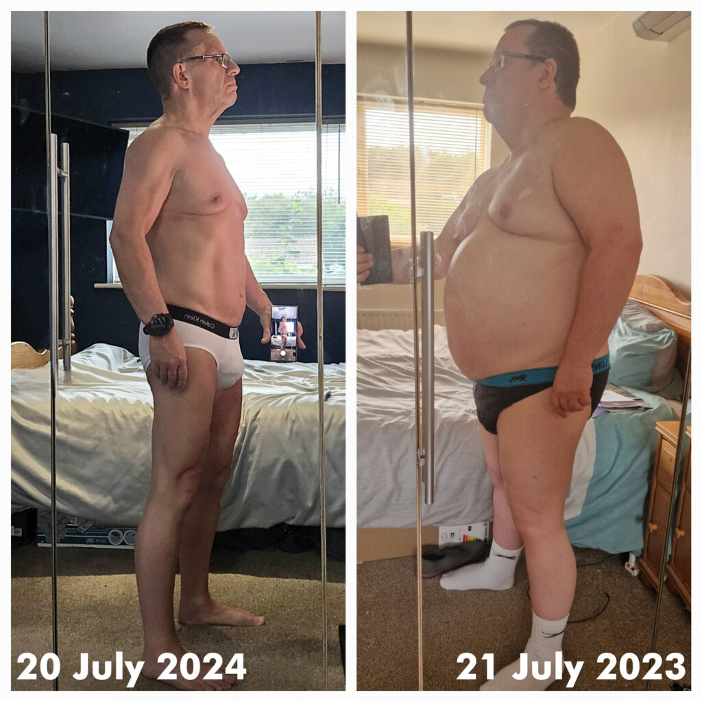 I woke on the morning of Thursday 20th July 2023 knowing that I needed to make changes. 55 years old, 5ft 7in and weighing 110kg (17st 4lbs). I ordered diet meal replacement shakes from Protein Works. These arrived the next day and lunch time of 21st July my fitness “reboot” started. I had alreadt taken my “Day One” photos but little did I know where this journey would take me. A journey that was supposed to be just a simple weight loss diet.